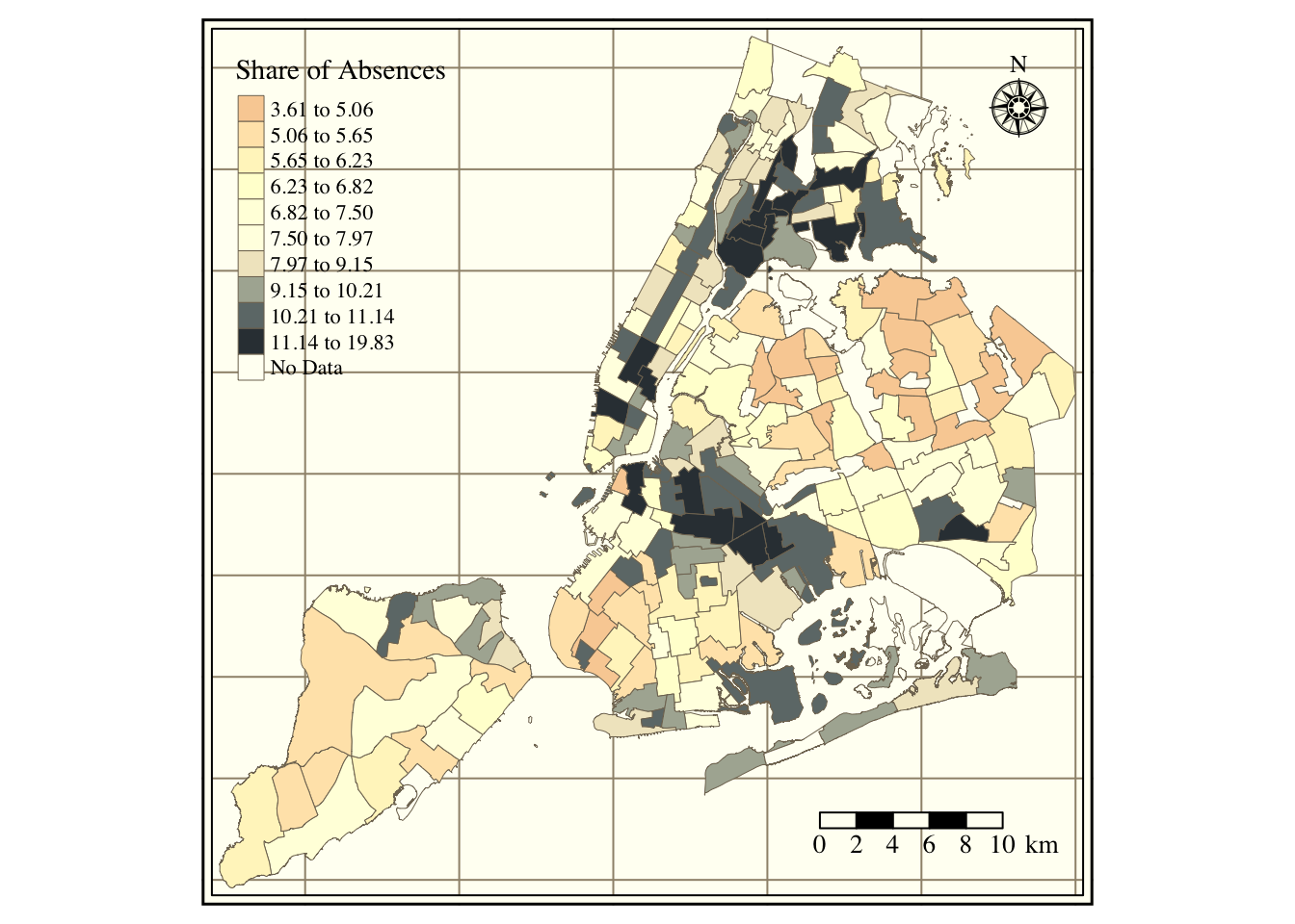 # Construct the data for the plot map = AbsentNta |>group_by(ntacode) |>summarise(`Share of Absences`=mean(absent, na.rm = T)/mean(enrolled, na.rm = T)) %>%left_join(NtaShp, .) |>mutate(`Share of Absences`=`Share of Absences`*100)# Plot the map seriestmap_style("classic"); tm_graticules(labels.inside.frame = T, labels.show = F) +tm_shape(map) +tm_fill(col ="Share of Absences", style ="quantile", n =10, palette ="RdBu", colorNA ="white", textNA ="No Data") +tm_borders(lwd =0.5) +tm_compass(type ="rose", position =c("right", "top"), size =2) +tm_scale_bar(width =0.2, position =c("right", "bottom"), text.size =1)