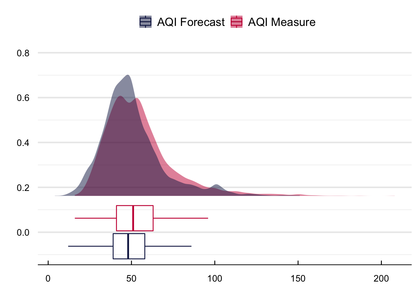 plot =filter(aqif, date <"2018-12-31") |>mutate(weekday =weekdays(date)) %>%left_join(., aqi) %>%select(date, `AQI Forecast`= aqi, `AQI Measure`= RealAqi) %>%gather(., var, value, -date)# Plot the time series ggplot(plot) + ggdist::stat_halfeye(aes(x = value, fill = var), height = .6, justification =-.3,.width =0, point_colour =NA, alpha =0.5) +geom_boxplot(aes(x = value, color = var), width = .25, fill ="transparent", outlier.shape =NA) +coord_cartesian(ylim =c(-0.1, 0.8)) +labs(x ="", y ="") +scale_fill_manual(values =c("#141F52", "#c91d42")) +scale_color_manual(values =c("#141F52", "#c91d42")) +theme_economist() %+replace%theme(legend.title =element_blank(), plot.background =element_blank(),axis.title.x =element_text(vjust =-2)) +grids("y")