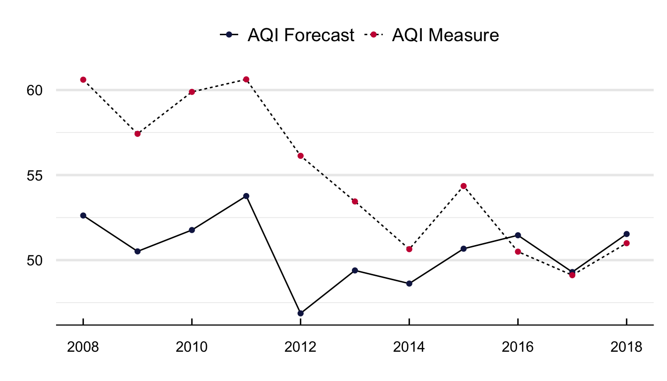 Table 3 contains descriptive statistics on the AQI and its forecast. The average and maximum forecast is slightly smaller (50.39) than the AQI (54.36). The average AQI is 54.36, slightly above the EPA threshold between good and moderate air quality.