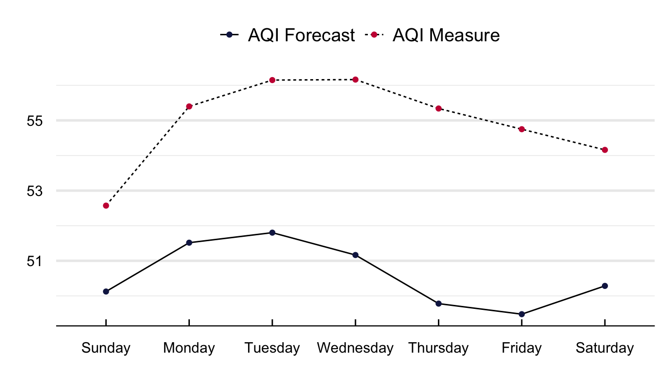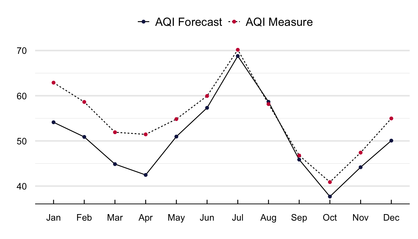 #### Yearly Differences ####plot =filter(aqif, date <"2018-12-31") |>mutate(year =year(date)) %>%left_join(., aqi) |>group_by(frame = year) %>%summarise(`AQI Forecast`=mean(aqi, na.rm = T), `AQI Measure`=mean(RealAqi, na.rm = T)) %>%gather(., var, value, -frame)#### Plot it ####ggplot(plot) +geom_line(aes(y = value, x = frame, group = var, linetype = var)) +geom_point(aes(y = value, x = frame, group =1, color = var)) +labs(x ="", y ="") +scale_color_manual(values =c("#141F52", "#c91d42")) +scale_x_continuous(breaks =pretty_breaks()) +theme_economist()%+replace%theme(legend.title =element_blank(), plot.background =element_blank(),axis.title.y =element_text(vjust =2, angle =90)) +grids("y")#### Monthly time series ####plot =filter(aqif, date <"2018-12-31") |>mutate(month =month(date, label = T)) %>%left_join(., aqi) |>group_by(frame = month) %>%summarise(`AQI Forecast`=mean(aqi, na.rm = T), `AQI Measure`=mean(RealAqi, na.rm = T)) %>%gather(., var, value, -frame)#### Plot it ####ggplot(plot) +geom_line(aes(y = value, x = frame, group = var, linetype = var)) +geom_point(aes(y = value, x = frame, group =1, color = var)) +labs(x ="", y ="") +scale_color_manual(values =c("#141F52", "#c91d42")) +theme_economist()%+replace%theme(legend.title =element_blank(), plot.background =element_blank(),axis.title.y =element_text(vjust =2, angle =90)) +grids("y")#### Weekday differences ####plot =filter(aqif, date <"2018-12-31") |>mutate(weekday =weekdays(date)) %>%left_join(., aqi) |>group_by(frame = weekday) %>%summarise(`AQI Forecast`=mean(aqi, na.rm = T), `AQI Measure`=mean(RealAqi, na.rm = T)) %>%gather(., var, value, -frame) %>%mutate(frame =as_factor(frame)) |>mutate(frame =fct_relevel(frame, c("Sunday", "Monday", "Tuesday", "Wednesday", "Thursday", "Friday", "Saturday")))#### Plot it ####ggplot(plot) +geom_line(aes(y = value, x = frame, group = var, linetype = var)) +geom_point(aes(y = value, x = frame, group =1, color = var)) +labs(x ="", y ="") +scale_color_manual(values =c("#141F52", "#c91d42")) +theme_economist()%+replace%theme(legend.title =element_blank(), plot.background =element_blank(),axis.title.y =element_text(vjust =2, angle =90)) +grids("y")