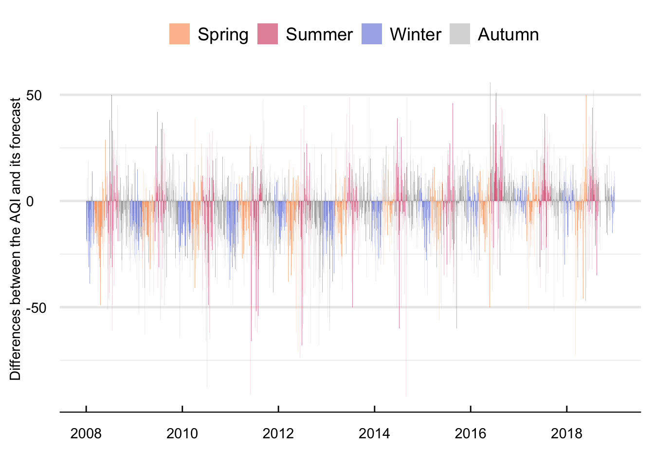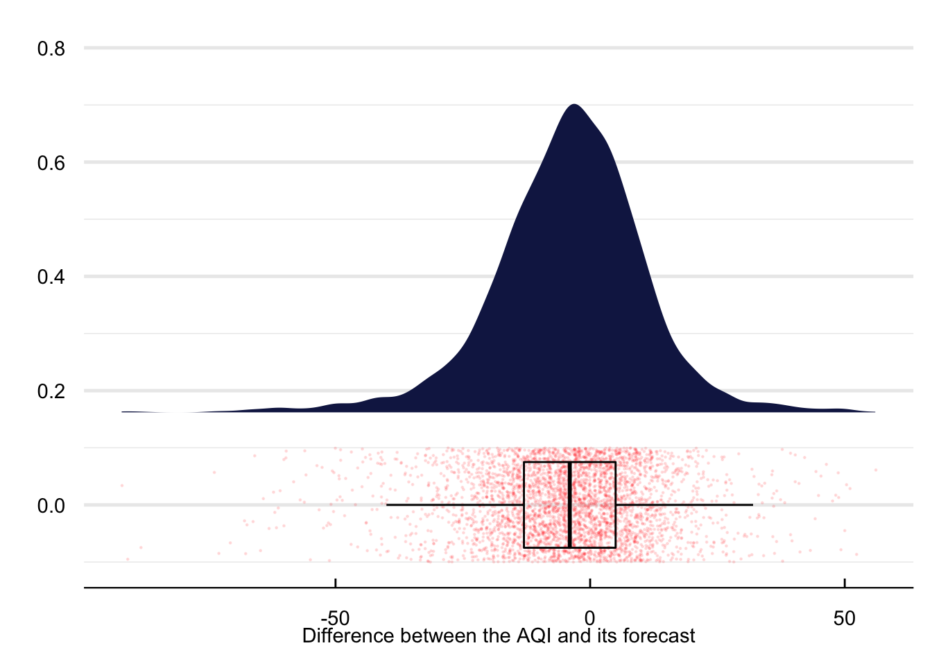 #### Data for plotting daily differences between the AQI and the forecast ####plot =filter(aqif, date <"2018-12-31") |>mutate(season = hydroTSM::time2season(date, out.fmt ="seasons")) |>mutate(season =str_to_title(season)) %>%left_join(., aqi) |>mutate(diff = aqi-RealAqi)#### Time series of differencesggplot(plot) +geom_bar(aes(x = date, y =diff, fill = season), stat ="identity", alpha =0.5) +labs(y ="Differences between the AQI and its forecast", x ="") +scale_fill_manual(values =c("Spring"="#F97A1F", "Summer"="#C91D42", "Winter"="#475ED1", "Autumn"="#B3B3B3")) +theme_economist() %+replace%theme(legend.title =element_blank(), axis.title.y =element_text(vjust =2, angle =90), plot.background =element_blank()) +grids("y")#### Plot the density distribution of differences ####ggplot(plot) +stat_halfeye(aes(x = diff), height = .6,justification =-.3,.width =0, point_colour =NA, fill ="#141F52") +geom_point(aes(x = diff, y =0), size =0.2, alpha = .1, position =position_jitter(seed =1, height =0.1), color ="red") +geom_boxplot(aes(x = diff), width = .15, fill ="transparent", outlier.shape =NA, color ="black") +coord_cartesian(ylim =c(-0.1, 0.8)) +labs(x ="Difference between the AQI and its forecast", y ="") +theme_economist() %+replace%theme(legend.title =element_blank(), axis.title.y =element_text(vjust =2, angle =90), plot.background =element_blank()) +grids("y")