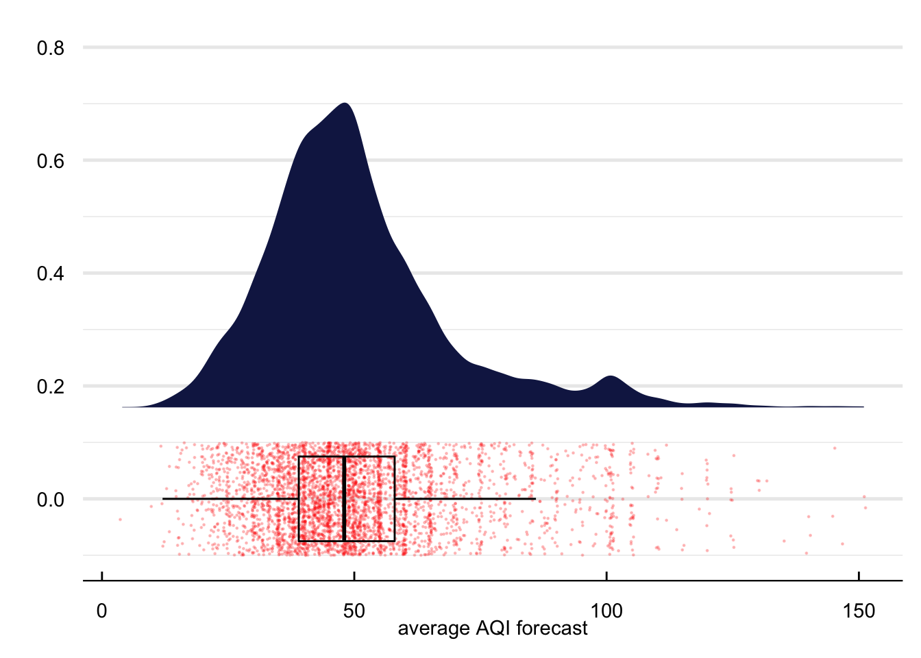 # Plot the time series ggplot(aqif) + ggdist::stat_halfeye(aes(x = aqi), height = .6, justification =-.3,.width =0, point_colour =NA, fill ="#141f52") +geom_point(aes(x = aqi, y =0), size =0.2, alpha = .2, position =position_jitter(seed =1, height =0.1), color ="red") +geom_boxplot(aes(x = aqi), width = .15, fill ="transparent", outlier.shape =NA, color ="black") +coord_cartesian(ylim =c(-0.1, 0.8)) +theme_economist() %+replace%theme(legend.title =element_blank(), axis.title.y =element_text(vjust =2, angle =90), plot.background =element_blank()) +grids("y") +labs(x ="average AQI forecast", y ="")