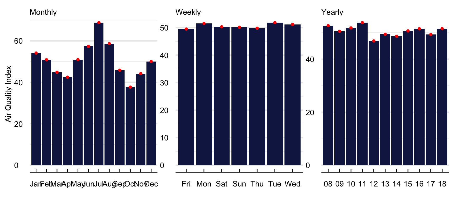 ## Construct the data for the plot plot =list(Yearly =filter(aqif, date <"2018-12-31") |>mutate(year =substr(year(date),3,4)) |>group_by(frame = year) %>%summarise(aqi =mean(aqi, na.rm = T)), Monthly =filter(aqif, date <"2018-12-31") |>mutate(month =month(date, label = T)) |>group_by(frame = month) %>%summarise(aqi =mean(aqi, na.rm = T)), Weekly =filter(aqif, date <"2018-12-31") |>mutate(weekday =weekdays(date, abbreviate = T)) |>group_by(frame = weekday) %>%summarise(aqi =mean(aqi, na.rm = T))) %>%rbindlist(., idcol ="window")# Compute the deviation from the meanplot = plot |>group_by(window) |>mutate(change = ((aqi -mean(aqi))/mean(aqi))*100)# Plot the time series ggplot(plot) +geom_bar(aes(y = aqi, x = frame, group =1), fill ="#141f52", stat ="identity") +geom_point(aes(y = aqi, x = frame, group =1), color ="red") +labs(x ="", y ="Air Quality Index") +facet_wrap(~window, scales ="free") +theme_economist()%+replace%theme(legend.title =element_blank(), plot.background =element_blank(),axis.title.y =element_text(vjust =2, angle =90), strip.text =element_text(hjust =0)) +grids("y")