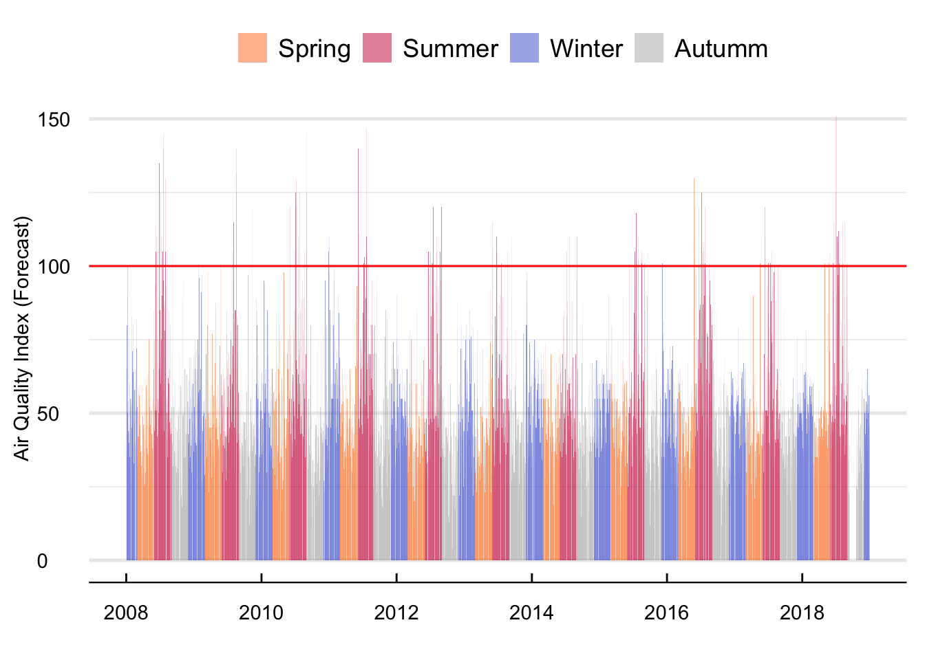#### Construct the data for the plot plot =filter(aqif, date <"2018-12-31") |>mutate(season = hydroTSM::time2season(date, out.fmt ="seasons")) |>mutate(season =str_to_title(season)) #### Plot the time seriesggplot(plot) +geom_bar(aes(x = date, y =aqi, fill = season), stat ="identity", alpha =0.5) +geom_hline(aes(yintercept =100), color ="red") +labs(y ="Air Quality Index (Forecast)", x ="") +scale_fill_manual(values =c("Spring"="#F97A1F", "Summer"="#C91D42", "Winter"="#475ED1", "Autumm"="#B3B3B3")) +theme_economist() %+replace%theme(legend.title =element_blank(), plot.background =element_blank(),axis.title.y =element_text(vjust =2, angle =90)) +grids("y")