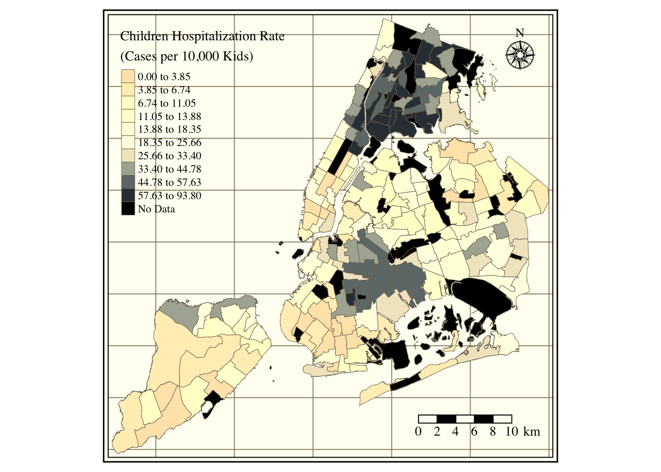 # Create the plot data# Simplify the shapefileplot =left_join(NtaShp, asthma)# Plot the map of schools in New Yorktmap_style("classic"); tm_graticules(labels.inside.frame = T, labels.show = F) +tm_shape(plot) +tm_fill(col ="HospChildrenRate", style ="quantile", n =10, title =str_wrap("Children Hospitalization Rate (Cases per 10,000 Kids)", width =30),palette ="RdBu", colorNA ="black", textNA ="No Data") +tm_borders(lwd =0.5) +tm_compass(type ="rose", position =c("right", "top"), size =2) +tm_scale_bar(width =0.2, position =c("right", "bottom"), text.size =1)