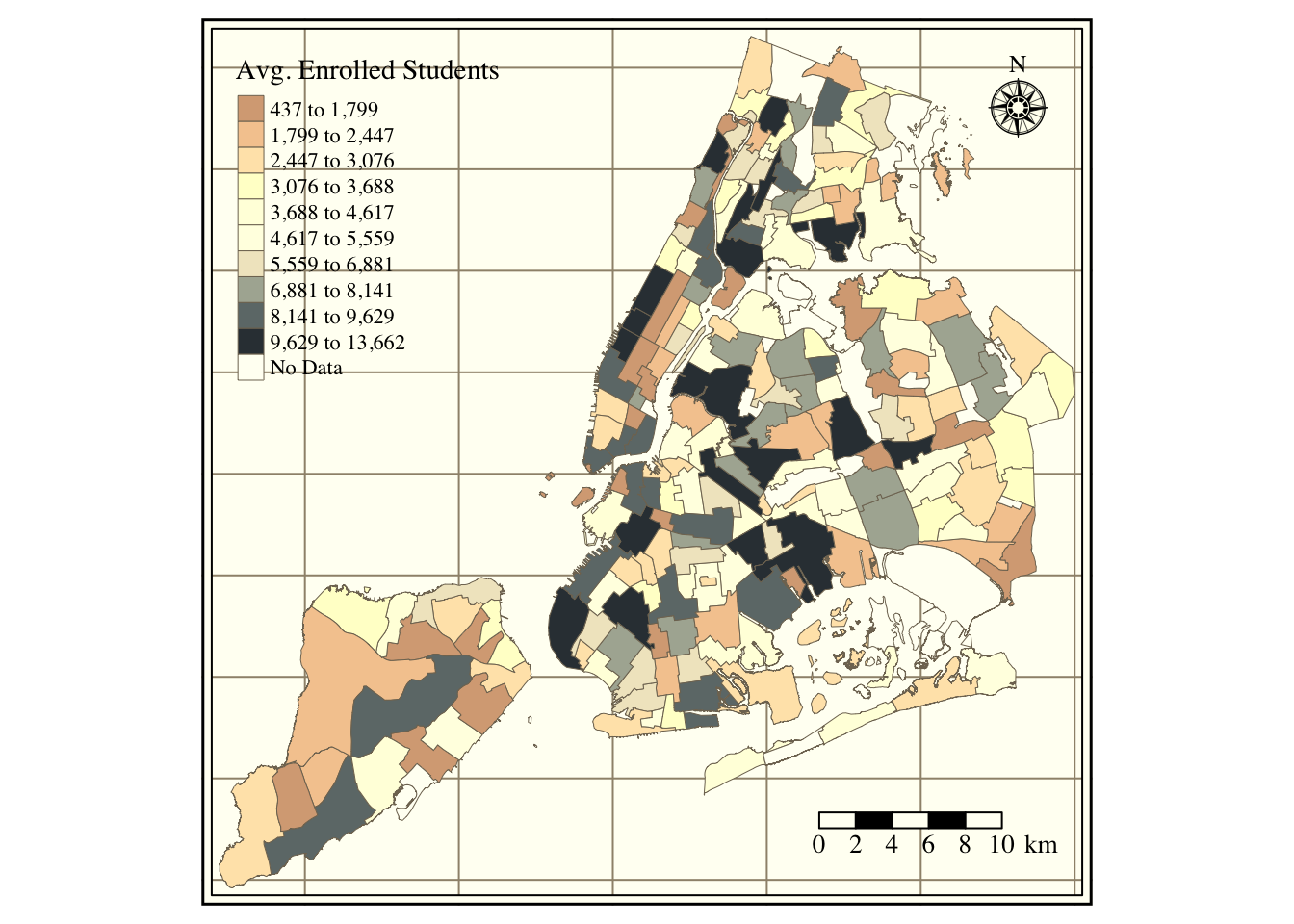 # Construct the data for the plot map = AbsentNta |>group_by(ntacode) |>summarise(`Avg. Enrolled Students`=mean(enrolled, na.rm = T)) %>%left_join(NtaShp, .)# Plot the map seriestmap_style("classic"); tm_graticules(labels.inside.frame = T, labels.show = F) +tm_shape(map) +tm_fill(col ="Avg. Enrolled Students", style ="quantile", n =10, palette ="RdBu", colorNA ="white", textNA ="No Data") +tm_borders(lwd =0.5) +tm_compass(type ="rose", position =c("right", "top"), size =2) +tm_scale_bar(width =0.2, position =c("right", "bottom"), text.size =1)