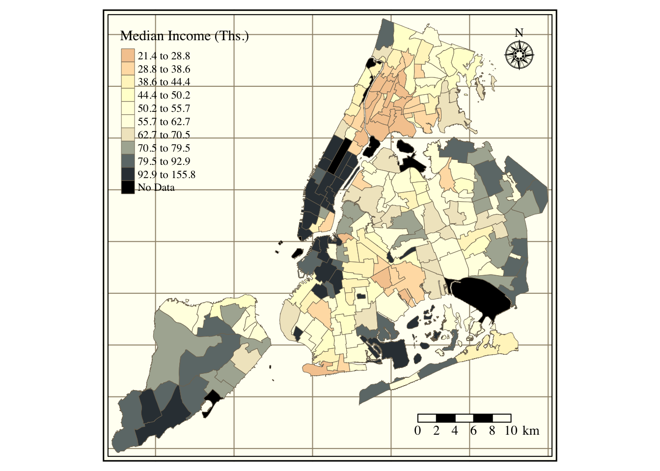 # Create the plot data# Simplify the shapefileplot =left_join(NtaShp, econ |>mutate(MedianIncome = MedianIncome/1000))# Plot the map of schools in New Yorktmap_style("classic"); tm_graticules(labels.inside.frame = T, labels.show = F) +tm_shape(plot) +tm_fill(col ="MedianIncome", style ="quantile", n =10, title ="Median Income (Ths.)", palette ="RdBu", colorNA ="black", textNA ="No Data") +tm_borders(lwd =0.5) +tm_compass(type ="rose", position =c("right", "top"), size =2) +tm_scale_bar(width =0.2, position =c("right", "bottom"), text.size =1)