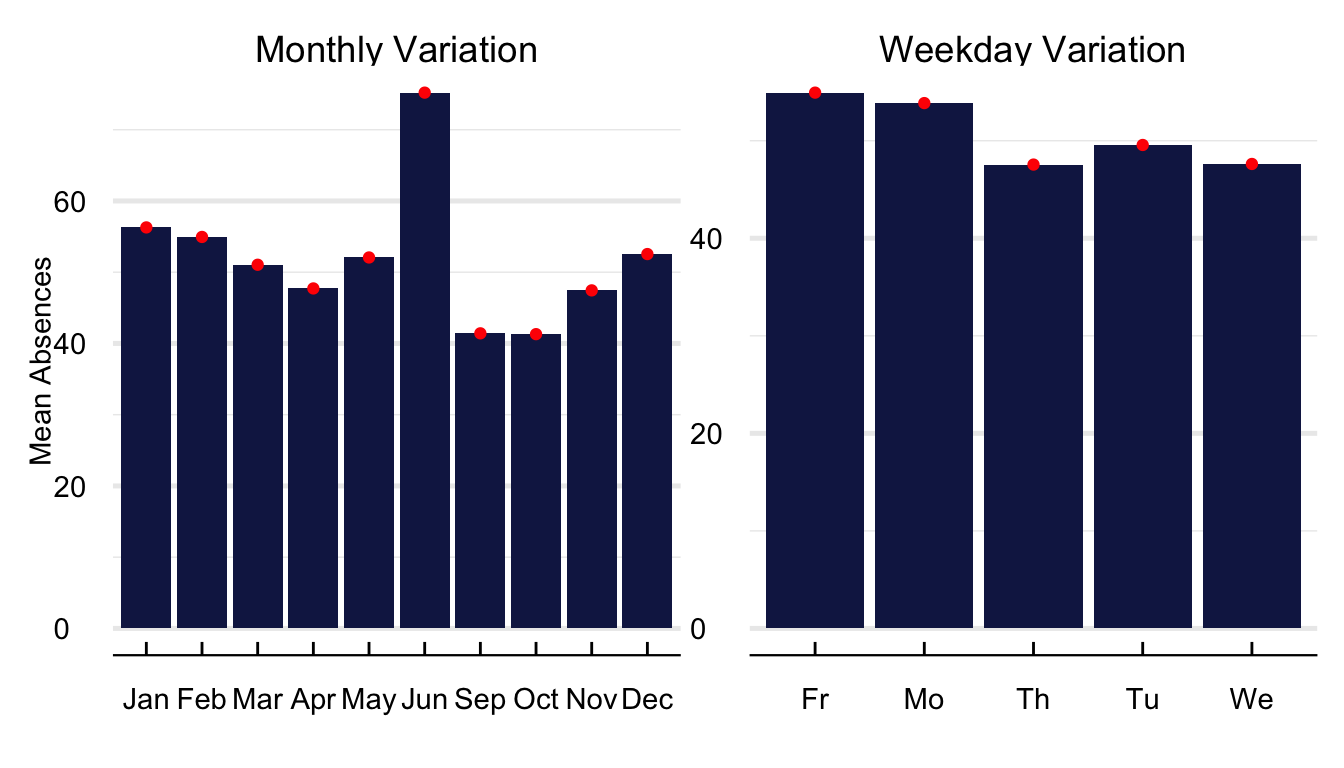 # Construct the data for the plot plot =list(`Monthly Variation`= absent |> dplyr::filter(DayType =="NormalDay") |>filter(absent <quantile(absent, 0.99, na.rm = T)) |>mutate(month =month(date, label = T)) |>group_by(ts = month) |>summarise(absent =mean(absent, na.rm = T)) ,`Weekday Variation`= absent |> dplyr::filter(DayType =="NormalDay") |>filter(absent <quantile(absent, 0.99, na.rm = T)) |>mutate(weekday =substr(weekday, 1,2)) |>group_by(ts = weekday) |>summarise(absent =mean(absent, na.rm = T))) %>%rbindlist(., idcol ="window")# Plot the time seriesggplot(plot) +geom_bar(aes(x = ts, y = absent, group =1), stat ="identity", fill ="#141f52") +geom_point(aes(x = ts, y = absent, group =1), color ="red") +labs(y ="Mean Absences", x ="") +guides(fill ="none") +theme_economist() %+replace%theme(legend.title =element_blank(), plot.background =element_blank()) +grids("y") +facet_wrap(~window, scales ="free")