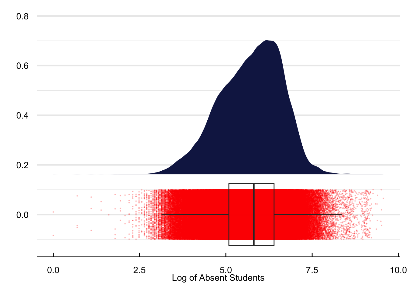 # Construct the data for the plot AbsentNta =left_join(absent |>filter(DayType =="NormalDay") |>filter(absent <quantile(absent, 0.99, na.rm = T)), location) |>group_by(nta, ntacode,date) |>summarise_at(vars(enrolled, absent, released), sum, na.rm = T) |>filter(absent >0)# Plot the time seriesggplot(AbsentNta) +stat_halfeye(aes(x =log(absent)), height = .6, justification =-.3, .width =0, point_colour =NA, fill ="#141f52") +geom_point(aes(x =log(absent), y =0), size =0.2, alpha = .2, position =position_jitter(seed =1, height =0.1), color ="red")+geom_boxplot(aes(x =log(absent)), width = .25, fill ="transparent", outlier.shape =NA) +labs(y ="", x ="Log of Absent Students") +theme_economist() %+replace%theme(legend.title =element_blank(), plot.background =element_blank()) +grids("y")