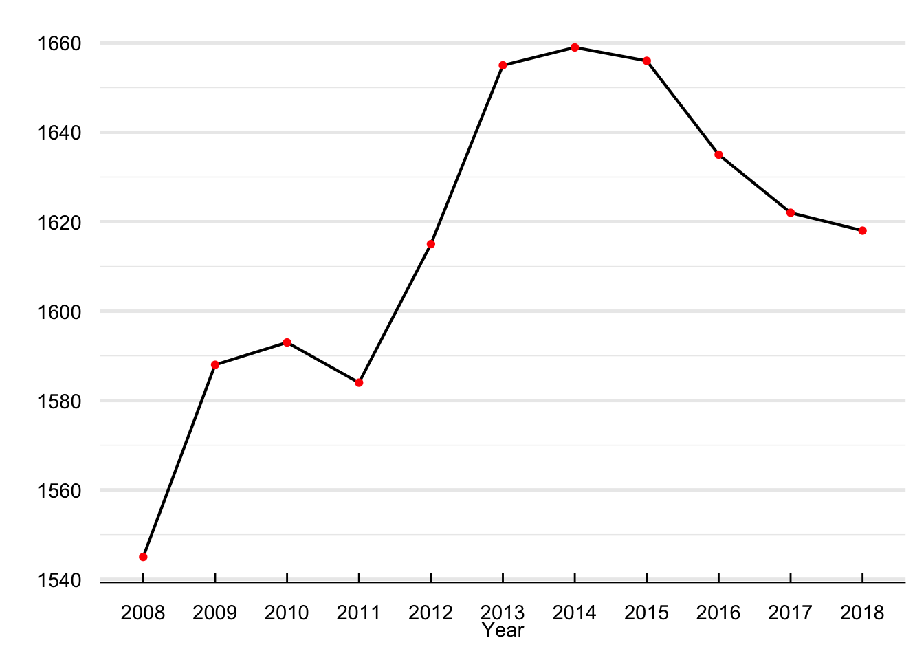 Figure 5 shows the number of schools per year reporting absences. Between 2008 and 2018, the number of reporting schools moved from a minimum of 1,545 in 2008 to a maximum of 1,659 in 2016. There are 1,365 schools in the data set that reported absenteeism for all years between 2008 and 2018. Although I use the entire sample in the regression analysis, I provide evidence that our results are robust to only focusing on the set of schools that never drop the panel.