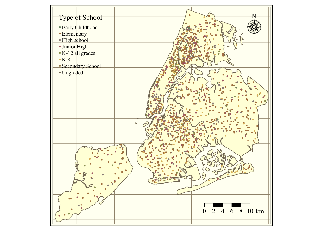 # Create the plot data# Simplify the shapefileBoroShp =st_transform(BoroShp, crs =4326) %>%st_simplify(., preserveTopology = T)# Transform the locations data frame into a spatial objectlocation =st_as_sf(location, coords =c("lon", "lat"), crs =4326)# Plot the map of schools in New Yorktmap_style("classic"); tm_graticules(labels.inside.frame = T, labels.show = F) +tm_shape(BoroShp) +tm_polygons() +tm_shape(location) +tm_dots(size =0.025, col ="SchoolType", palette ="Dark2", title ="Type of School") +tm_compass(type ="rose", position =c("right", "top"), size =2) +tm_scale_bar(width =0.2, position =c("right", "bottom"), text.size =1)