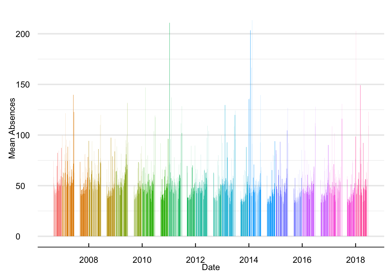 # Create the data for the plotplot = absent |>filter(DayType =="NormalDay") |>filter(absent <quantile(absent, 0.99, na.rm = T)) |>group_by(date, year) |>summarise(absent =mean(absent)) |>ungroup() |>mutate(RollMean =rollmean(absent, k =5, fill =NA))# Plot itggplot(plot) +geom_bar(aes(x = date, y = absent, fill =as_factor(year)), size =0.05, stat ="identity") +labs(y ="Mean Absences", x ="Date") +guides(fill ="none") +theme_economist() %+replace%theme(legend.title =element_blank(), plot.background =element_blank()) +grids("y")