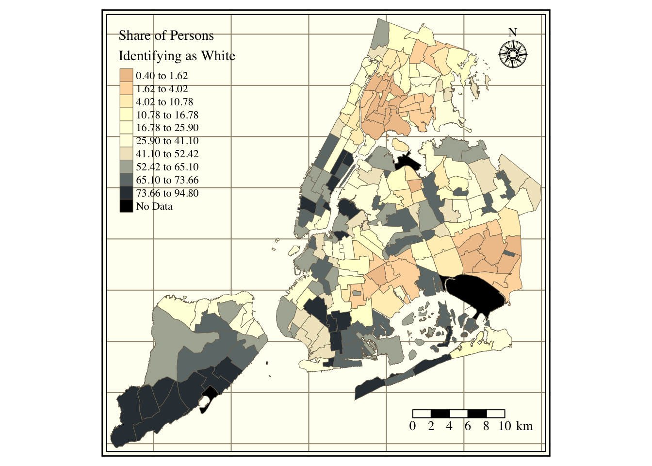 # Create the plot data# Simplify the shapefileplot =left_join(NtaShp, dem)# Plot the map of schools in New Yorktmap_style("classic"); tm_graticules(labels.inside.frame = T, labels.show = F) +tm_shape(plot) +tm_fill(col ="ShareWhite", style ="quantile", n =10,title =str_wrap("Share of Persons Identifying as White", width =25),palette ="RdBu", colorNA ="black", textNA ="No Data") +tm_borders(lwd =0.5) +tm_compass(type ="rose", position =c("right", "top"), size =2) +tm_scale_bar(width =0.2, position =c("right", "bottom"), text.size =1)